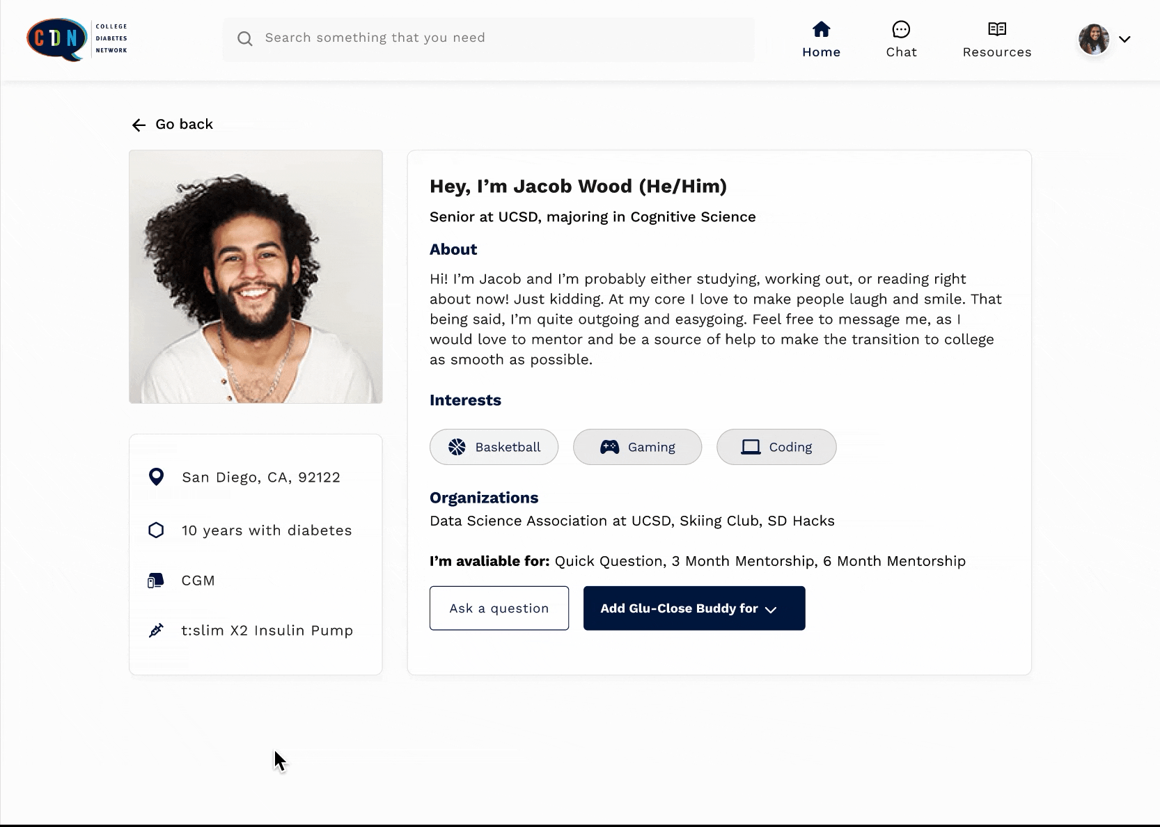 At the end of the project, my team and I felt genuinely excited about the positive impact Glu-Close Buddies could have on T1 diabetics that are transitioning to college. I was grateful to have worked with CDN on this platform and to have learned about the difficult experiences T1 diabetics have faced, and to hopefully make transitioning to college less of a concern and challenge for future students.