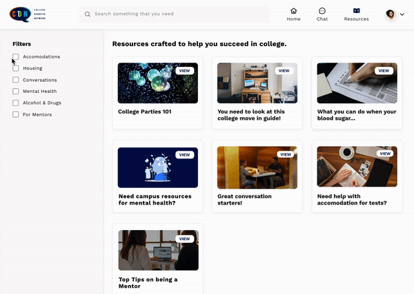 My team and I came up with an idea to merge a mentorship platform with the existing guides CDN has. This platform would connect prospective college students to current college students with T1 diabetes, who could answer questions and provide guidance as well as connect them with a broader community. The Off to College with Diabetes Guides would be broken up into smaller resource articles that will be accessible to mentees and mentors.